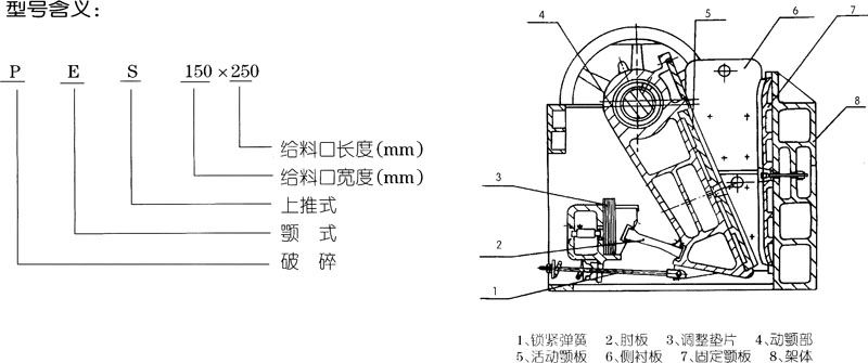——顎板、肘板、肘板墊、側(cè)襯板及拉桿彈簧式該破碎機的易損件,建議用戶儲備。